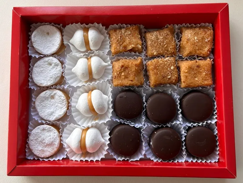 Variedad de dulces chilenos surtidos: mil hojas, empolvado, alfajor San Estanislao y alfajor de hojarasca, todo con nuestro clásico manjar blanco. 6 unidades de mil hojas con manjar blanco casero 6 unidades de alfajor con chocolate fino relleno con masa de almendra y manjar blanco 4 unidades de alfajor de hojarasca relleno con manjar blanco casero. 4 unidades de empolvados con manjar blanco en su interior. Cantidad: 20 unidades Conservación: Mantener sellado en un lugar fresco y seco , entre 10-18 °C, 65% humedad. Duración: 10 días.